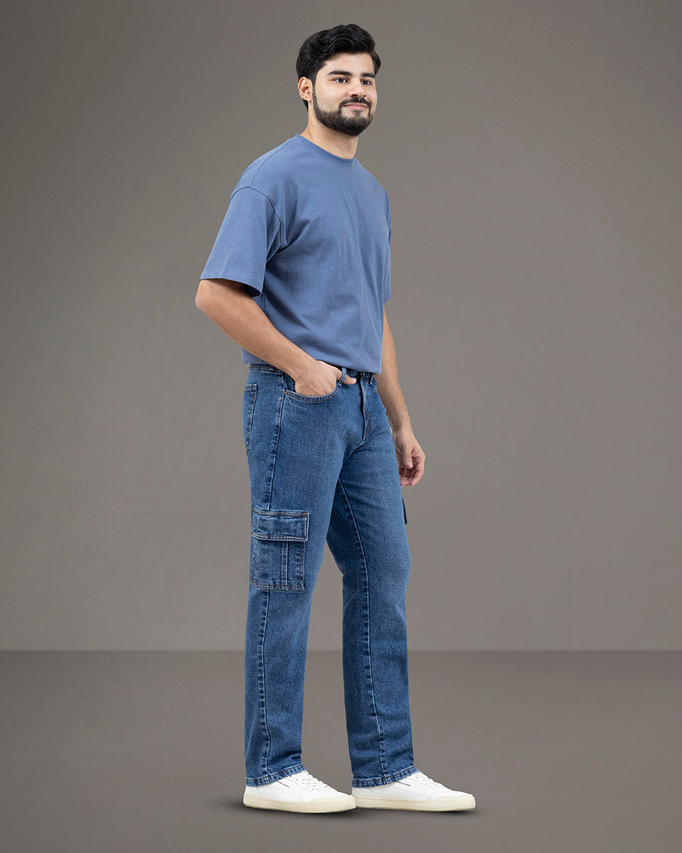 Jean cargo para hombre con corte de muslo flojo y ruedo recto.