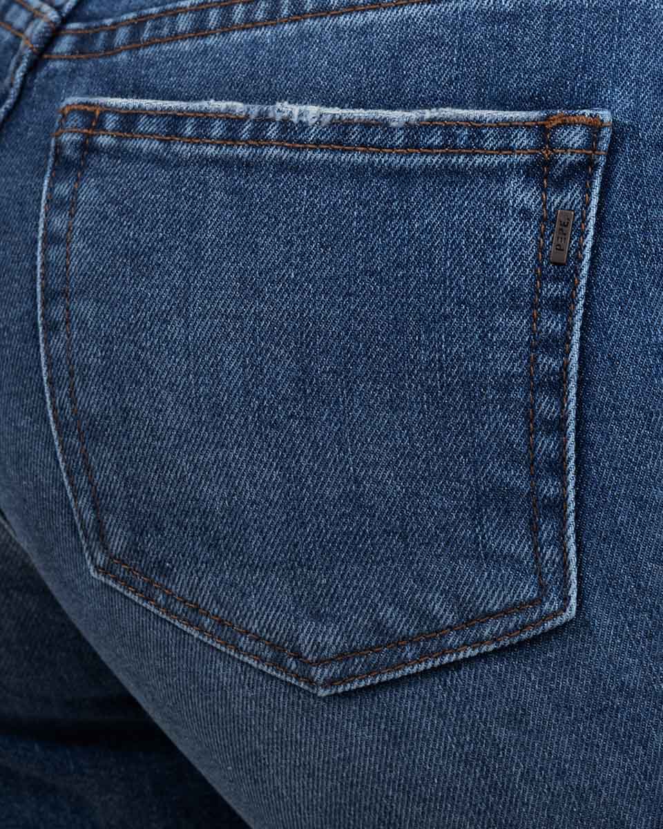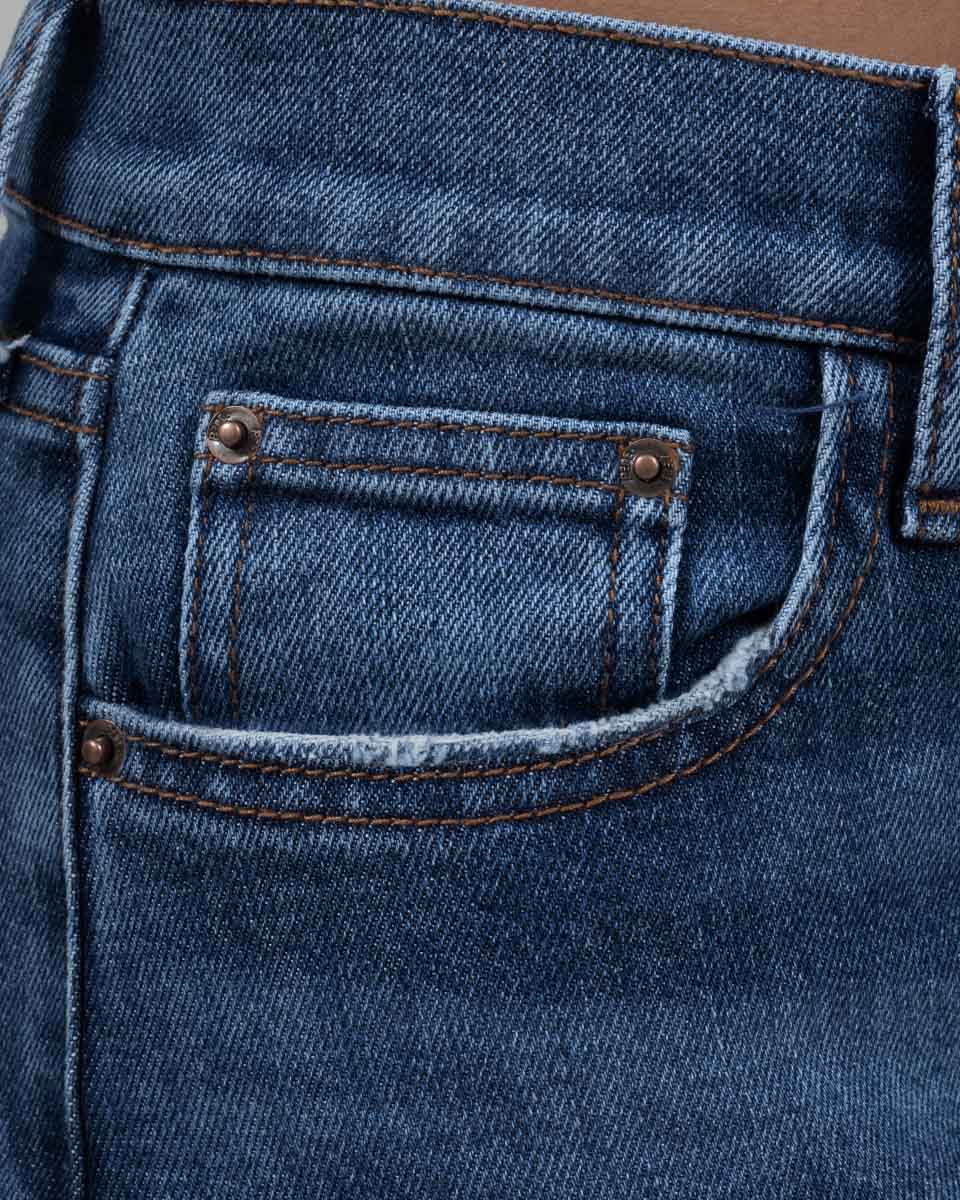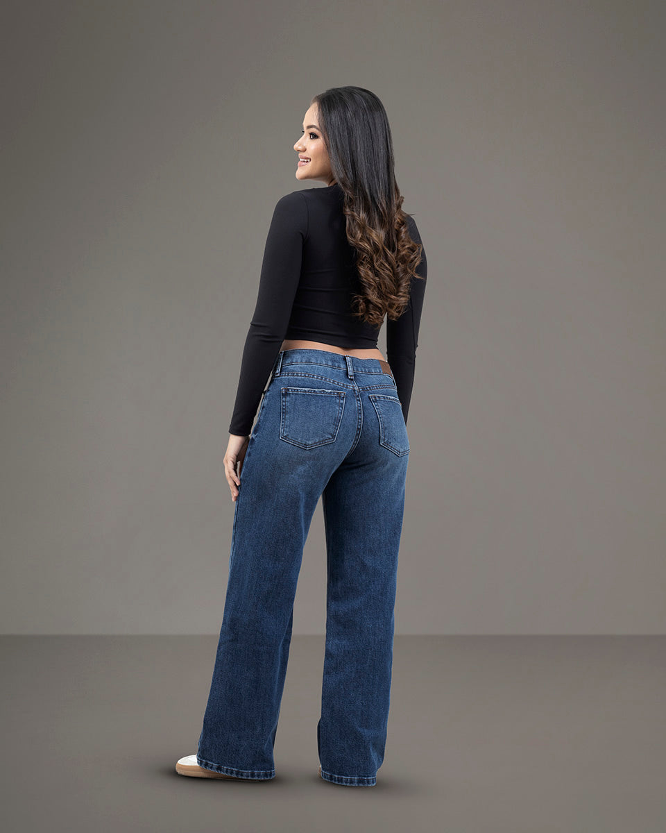 Jean para mujer de tiro medio y corte amplio desde el muslo hasta el ruedo.