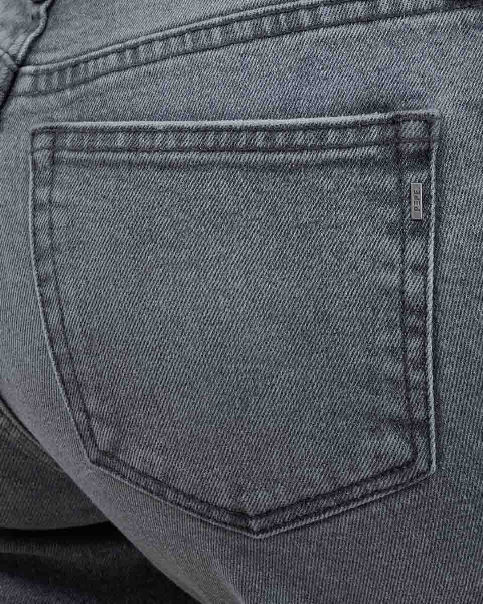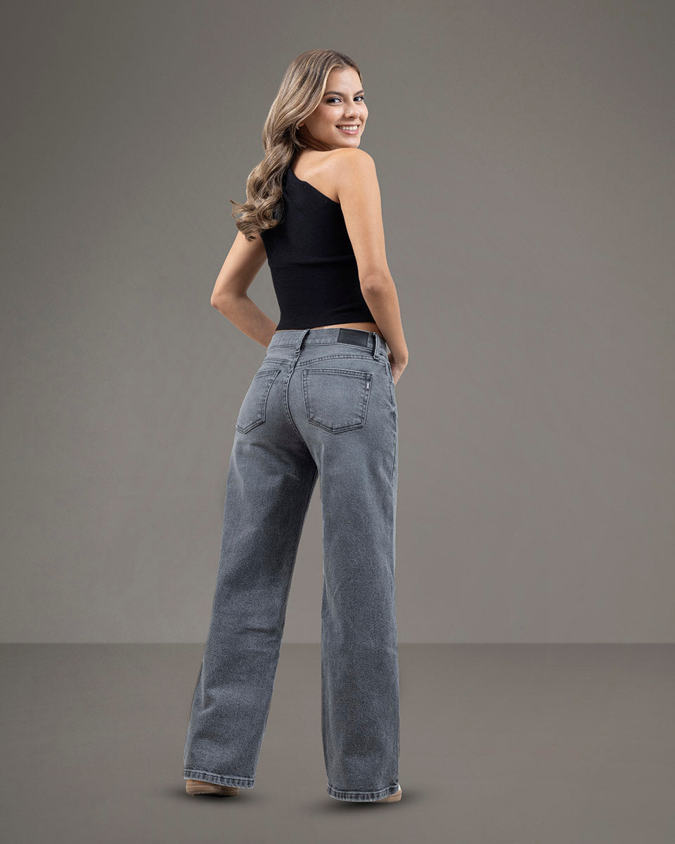 Jean para mujer de tiro medio y corte amplio desde el muslo hasta el ruedo.